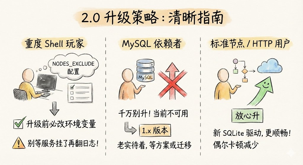 目前的更新说明中明确指出了对 MySQL 支持的移除。如果你的核心业务强依赖 MySQL 节点进行数据读写,现在的 2.0 版本会让你很难受。