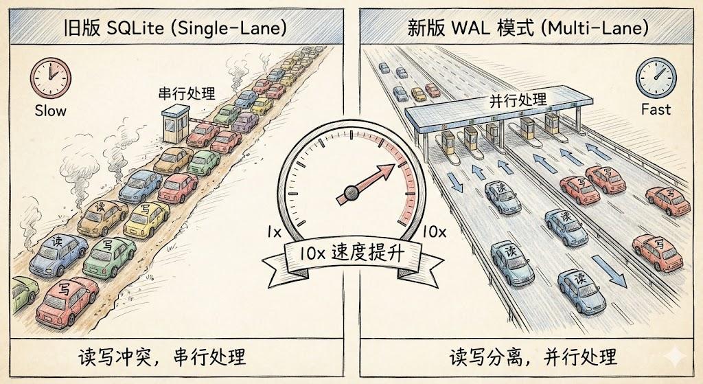 新技术使用了 WAL(Write-Ahead Logging)模式。简单说就是:它把读和写分开了,一个连接专门负责写,一组连接负责读。