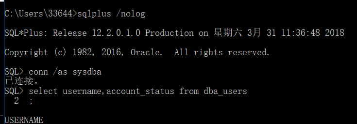 然后输入 conn /as sysdba 一管理员身份登录