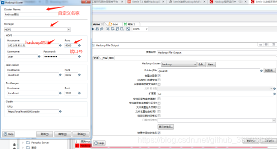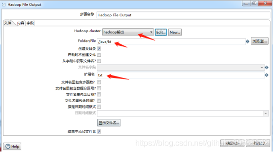 双击 Hadoop File output,点击new,配置hadoop需要的参数,把红色箭头指向的填好即可,其他的默认。然后点击测试