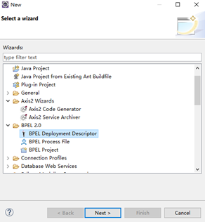 在bpel工程的bpelContent文件夹中创建一个deploy.xml文件。选择File->New->Other->BPEL 2.0 Apache ODE Deployment Descriptor,如图1.16所示,点击Next,直接Finish即会生成一个deploy.xml文件。