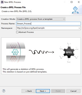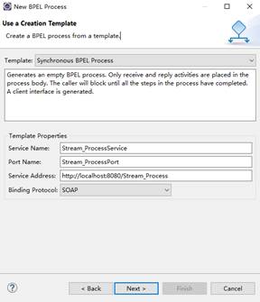 右键项目Stream_bpel,点击New->Other,选择BPEL 2.0- > New BPEL Process File,出现New BPEL Process对话框,输入流程名Stream_Process,名字空间设为:下拉选择,点击Next,如图1.2;下一步选择同步流程,如图1.3;最后点击Finish,如图1.4。