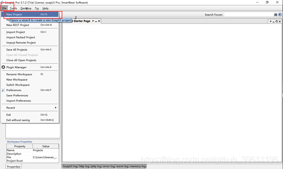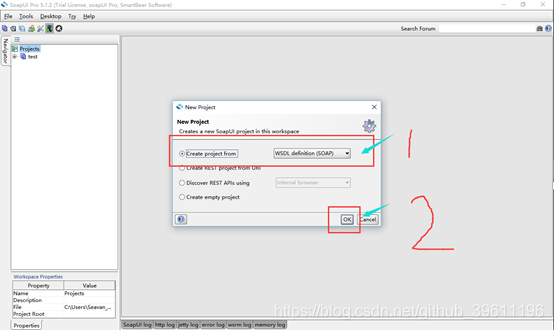 点击File->New Project创建SoapUI工程,如图2.3所示;左侧选择Create project from,右侧选择WSDL definition(SOAP),如图2.4所示;在Project Name后的框中输入项目名,并将第1步查看得到的BPEL工作流的WSDL的url输入Initial WSDL后的框中,最后点击OK按钮即可完成SoapUI工程的创建。