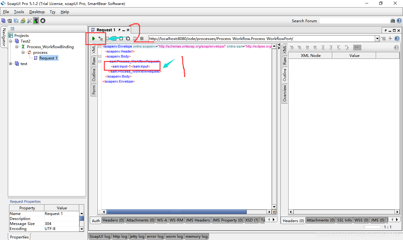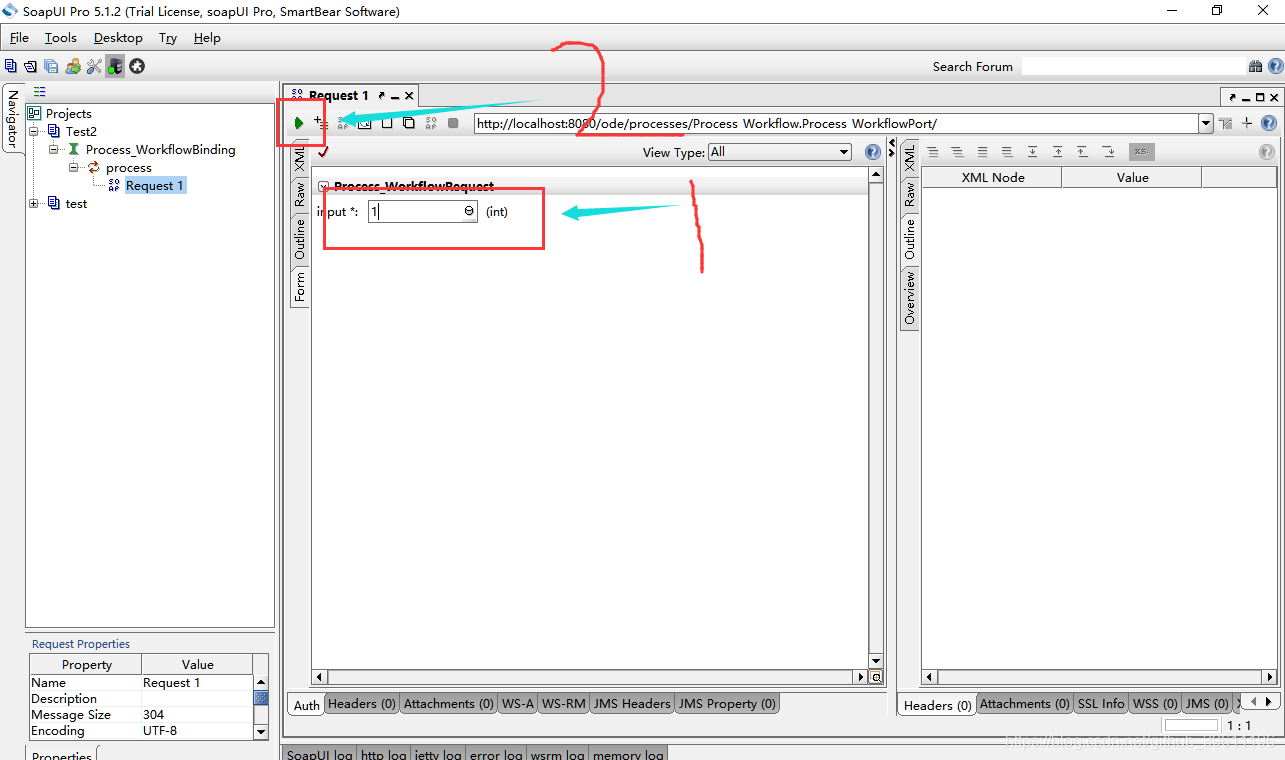 运行方法1:展开创建的SoapUI项目,并双击Request 1即可看到右侧的BPEL工作流运行界面,如图2.6所示;在右侧input框中输入BPEL工作流输入参数,点击图中箭头指向的绿色三角即可开始运行BPEL工作流,如图2.7所示。