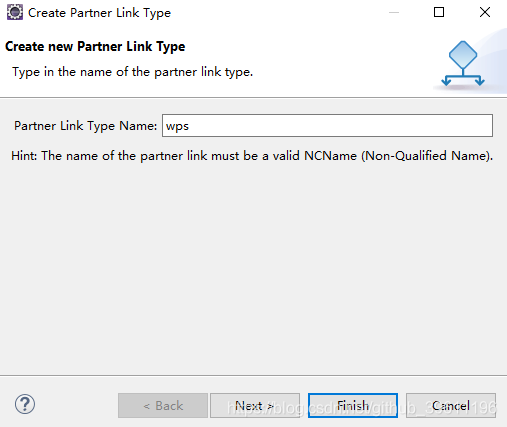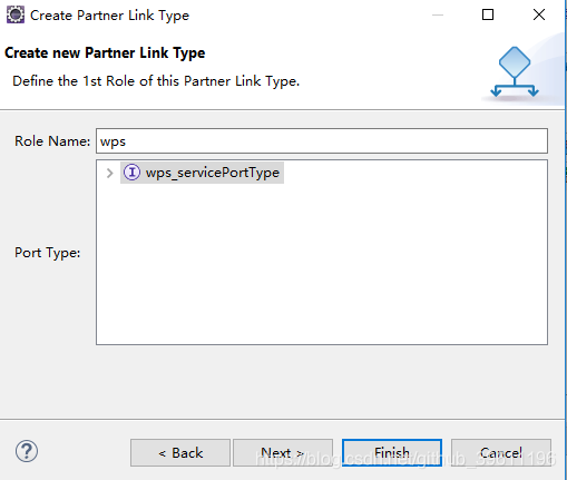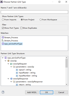 打开属性视图,Window->Show View->Properties,然后点击bpel流程中的invoke_wps节点,在Properties中选择Details选项卡,创建一个Partner Link,输入name,选择来自工程的服务例如wps_servicePortType,如图1.7,点击OK;然后输入Partner Link Type Name,如图1.8;最后输入一个Role Name即可,如图1.9,点击Finish。