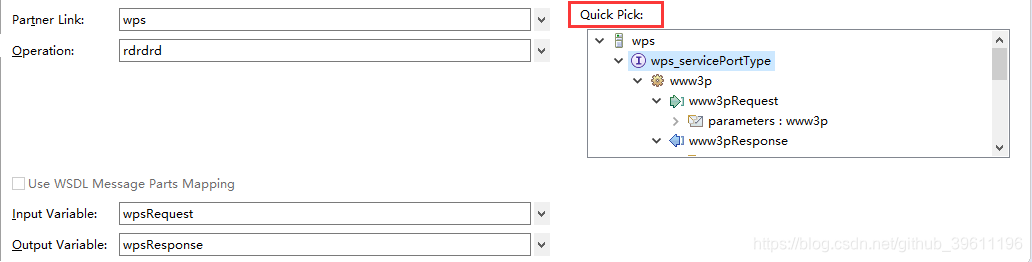 一个服务可以有多种处理功能,对应java类中的每一个函数,接下来指定Operation。双击Quick Pick中对应的函数名,Operation参数会自动添加,并自动创建该函数所需的参数变量,如图1.10所示。