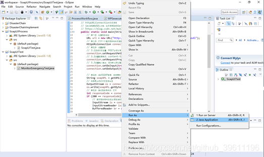 在Java类中,右键->Run As->Java Application,即可运行调用BPEL工作流的Java代码。