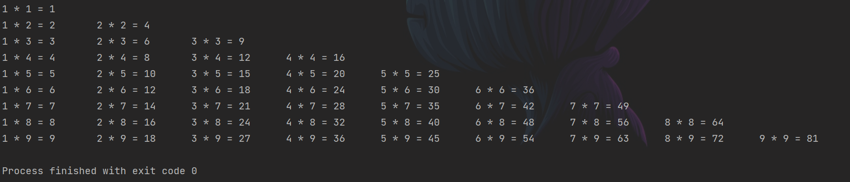 System.out.print(j + " * " + i + " = " + (i * j) + "\t\t");