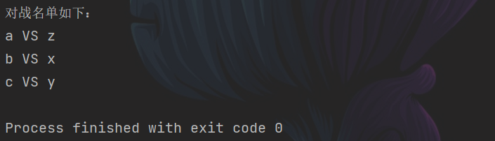 分别将 a、b、c 和 x、y、z 进行配对,然后除开不符合题意的组合,最后得出的结果就是比赛名单。主要还是利用 for 循环和 if 条件判断来实现!