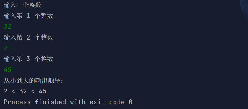 输入 3 个数存入数组中,然后利用 Arrays.sort() 进行排序,最后按照从小到到输出即可。