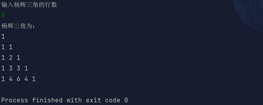 第 0 列和对角线上的数据全部为 1,其余位置上的数据为上一行正对数据与上一行正对前一个数据之和。