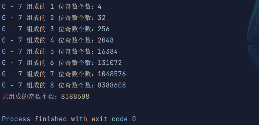 System.out.println("0 - 7 组成的 " + i + " 位奇数个数:" + sum);