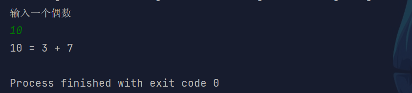 输入一个数之后,先判断其是否为偶数,然后判断它是否能分解为两个素数,即循环判断 2 ~ (num/2 + 1) 范围内是否存在一个素数与 num 减去该素数后是否仍然为素数。