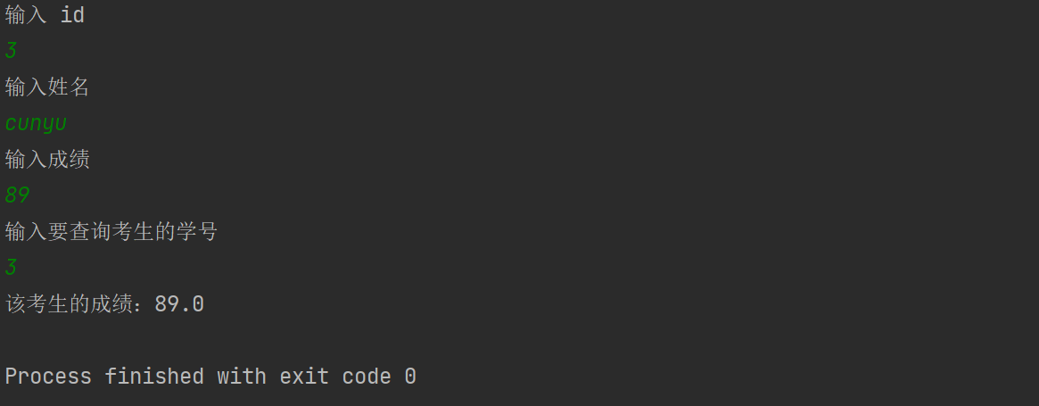 System.out.println("该考生的成绩:" + student.getRecord(id));