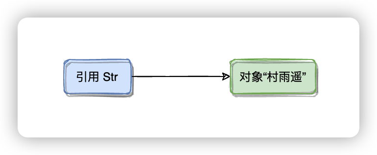 其中 str 既是一个变量,也是一个引用,指向一个值为 "村雨遥" 的 String 对象,后续如果我们要访问这个 String 对象,就需要使用 str 这个引用来代表它。
