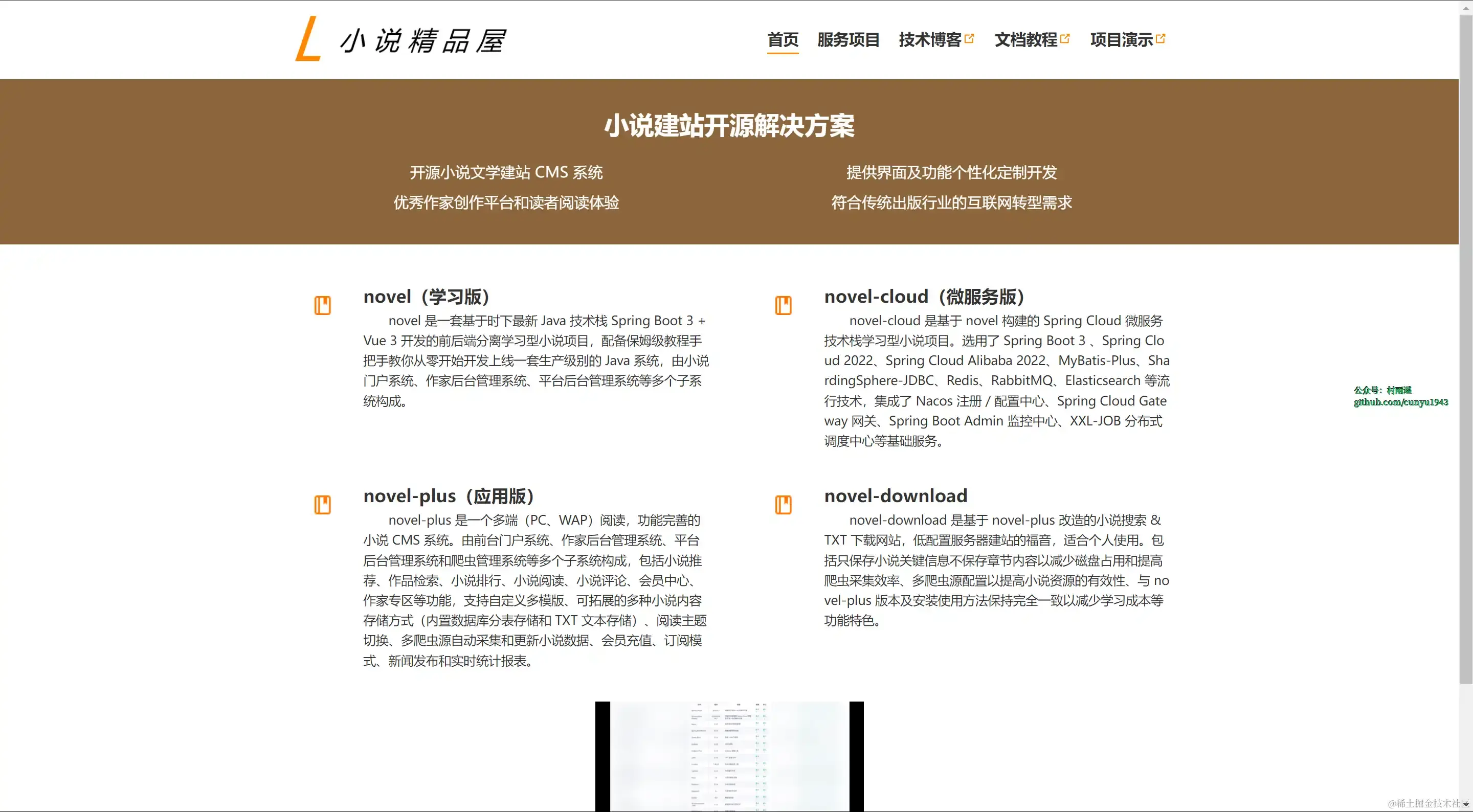 一套基于时下最新 Java 技术栈 Spring Boot 3 + Vue 3 开发的前后端分离学习型小说项目,配备保姆级教程手把手教你从零开始开发上线一套生产级别的 Java 系统,由小说门户系统、作家后台管理系统、平台后台管理系统等多个子系统构成。包括小说推荐、作品检索、小说排行榜、小说阅读、小说评论、会员中心、作家专区、充值订阅、新闻发布等功能。