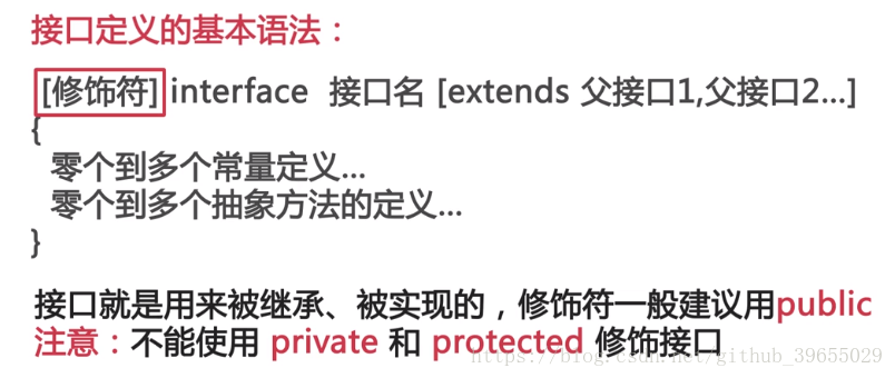 - 定义:一种特殊的类,由全局常量和公共的抽象方法所组成;