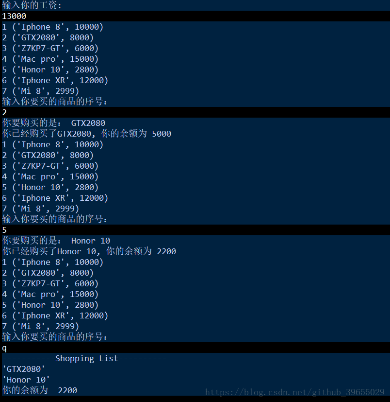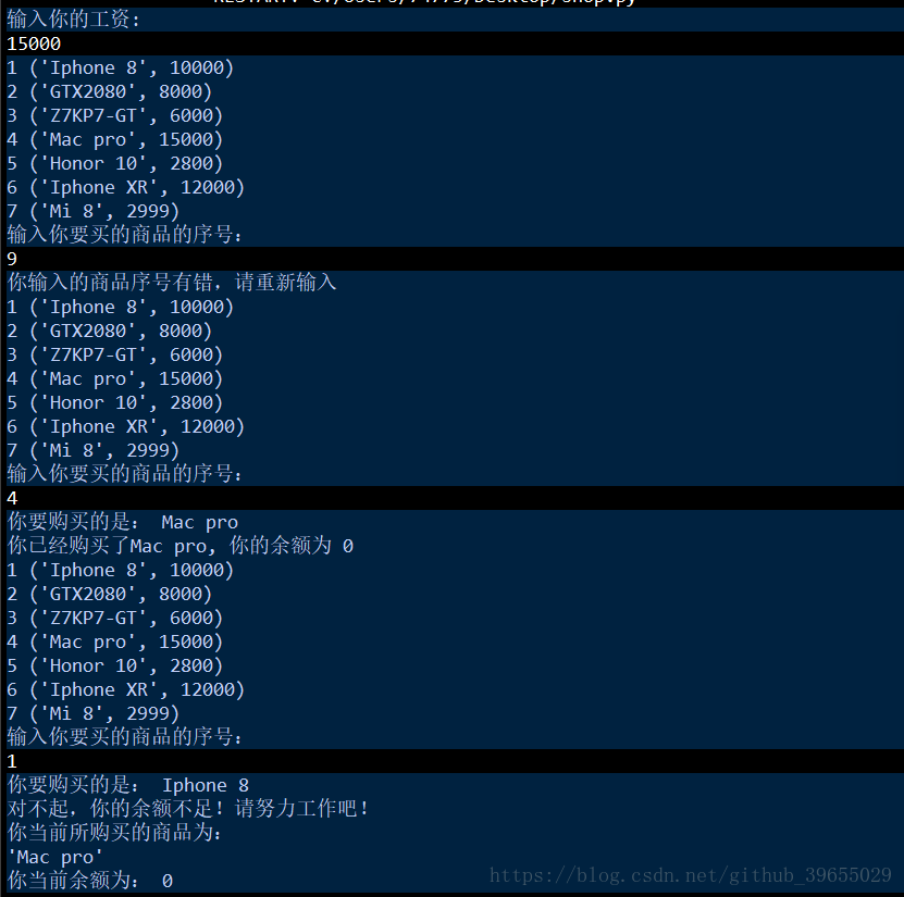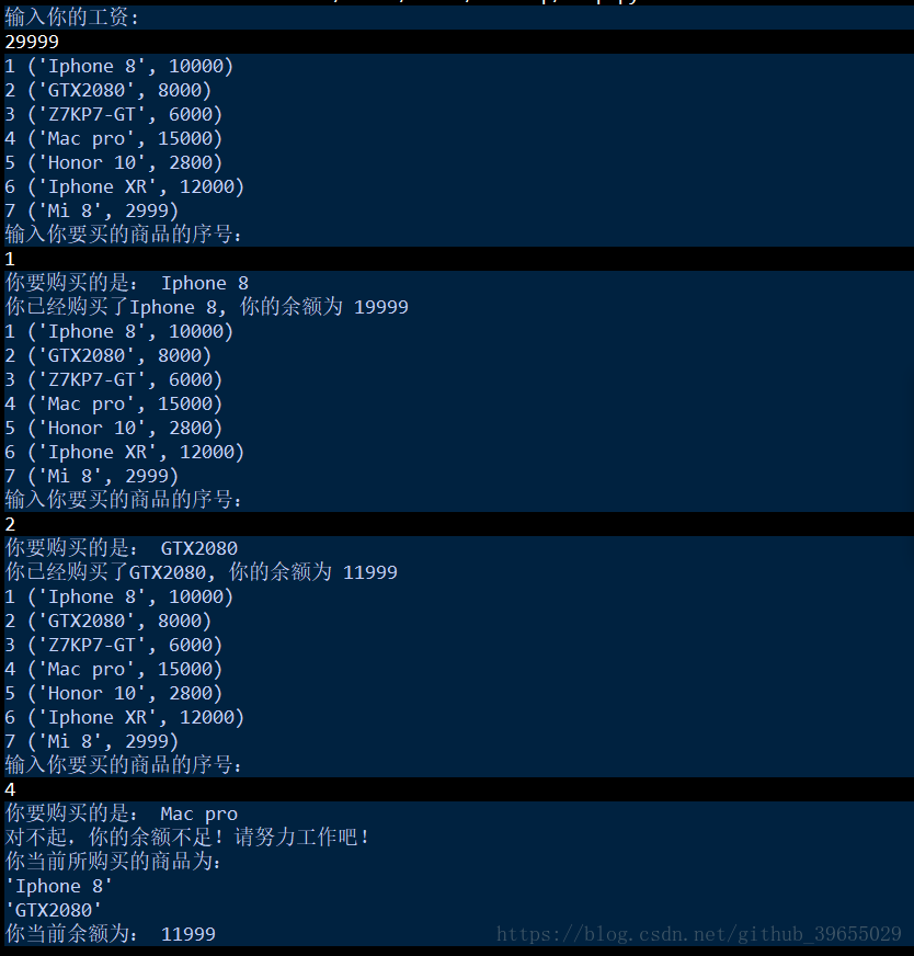 print('你已经购买了' + productList[userWant - 1][0] + ', 你的余额为 ' + str(salary))