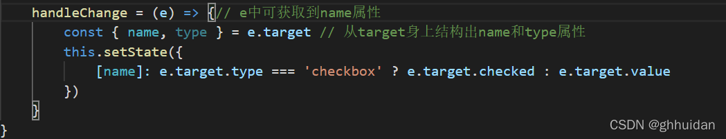 4,函数中通过e.target获取到name和元素的type属性,从而判断修改的是哪个元素,并重 新赋值。