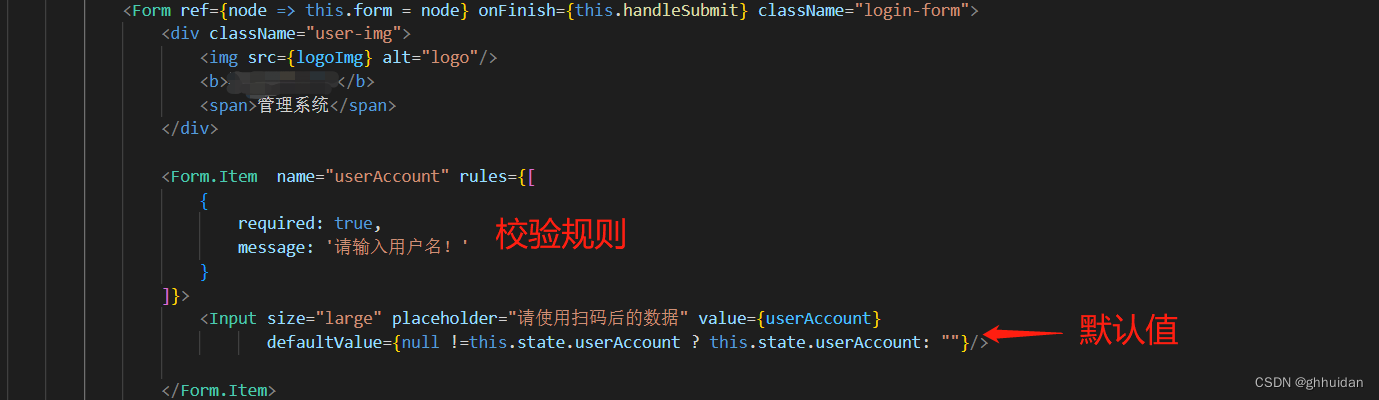 思路:默认值是Input输入框的,除非手动输入,否则Form表单并不能获取到Input的默认值,既然是表单的校验,则需要告诉表单,某个input有默认值,默认值为xxx。