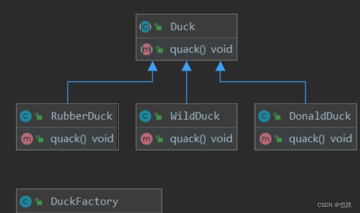 如下图,Duck是抽象的鸭子类,是所有类型鸭子的父类,每种类型的鸭子都需要继承父类并重写父类中的方法,这里体现了OOP中的多态