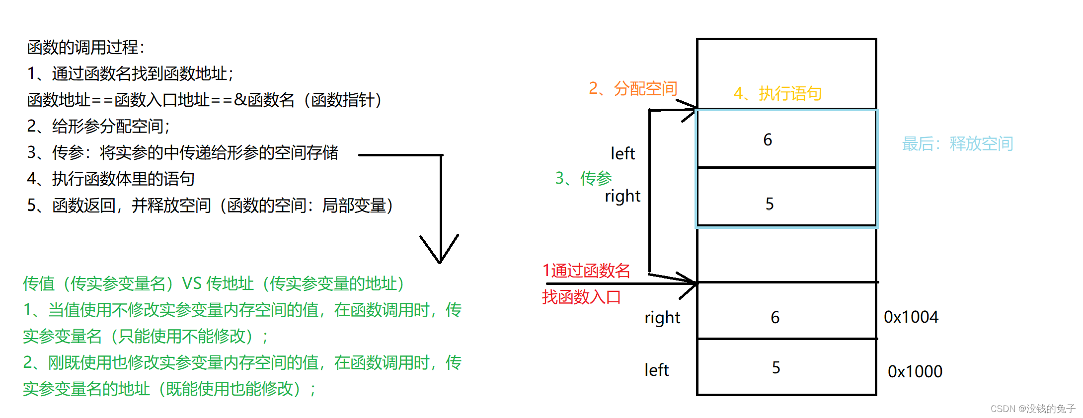 * 函数调用:函数名、实参的变量名或者实参的地址