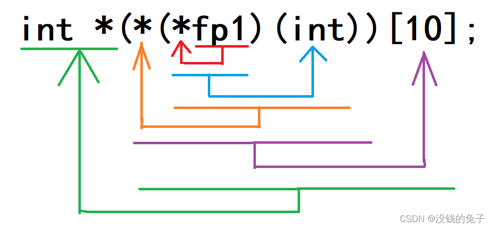 fp1:函数指针变量,指向的函数形参int,返回值是一个指针数组,该指针指向的数组里面里的每个元素都是int *