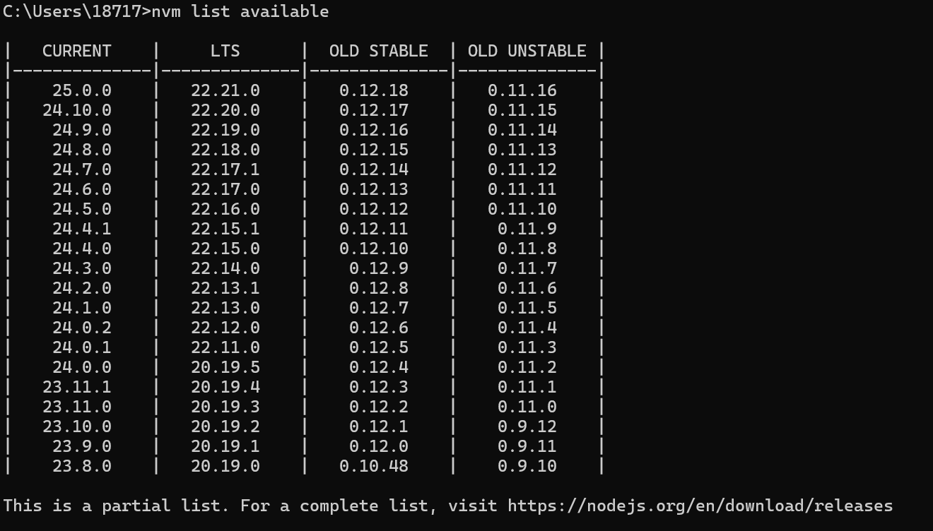 输入nvm list available,会看到部分可下载的node.js的版本。