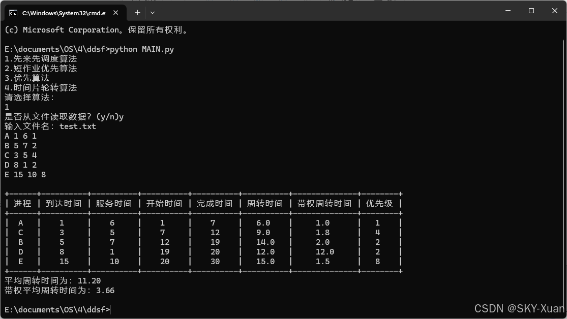print("带权平均周转时间为:%.2f"%adqzztime)# 除了rr的统一计算