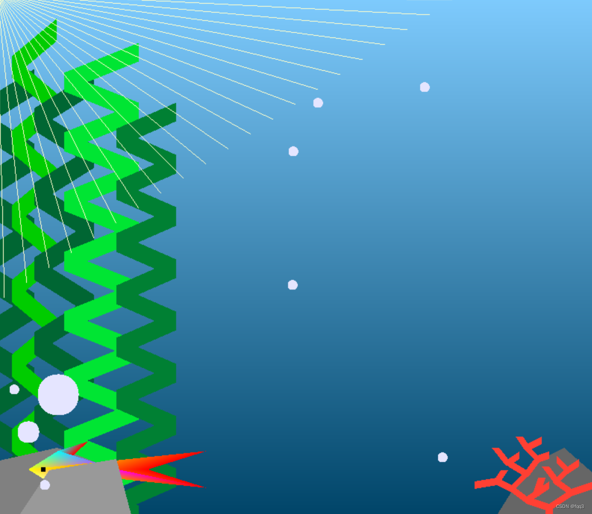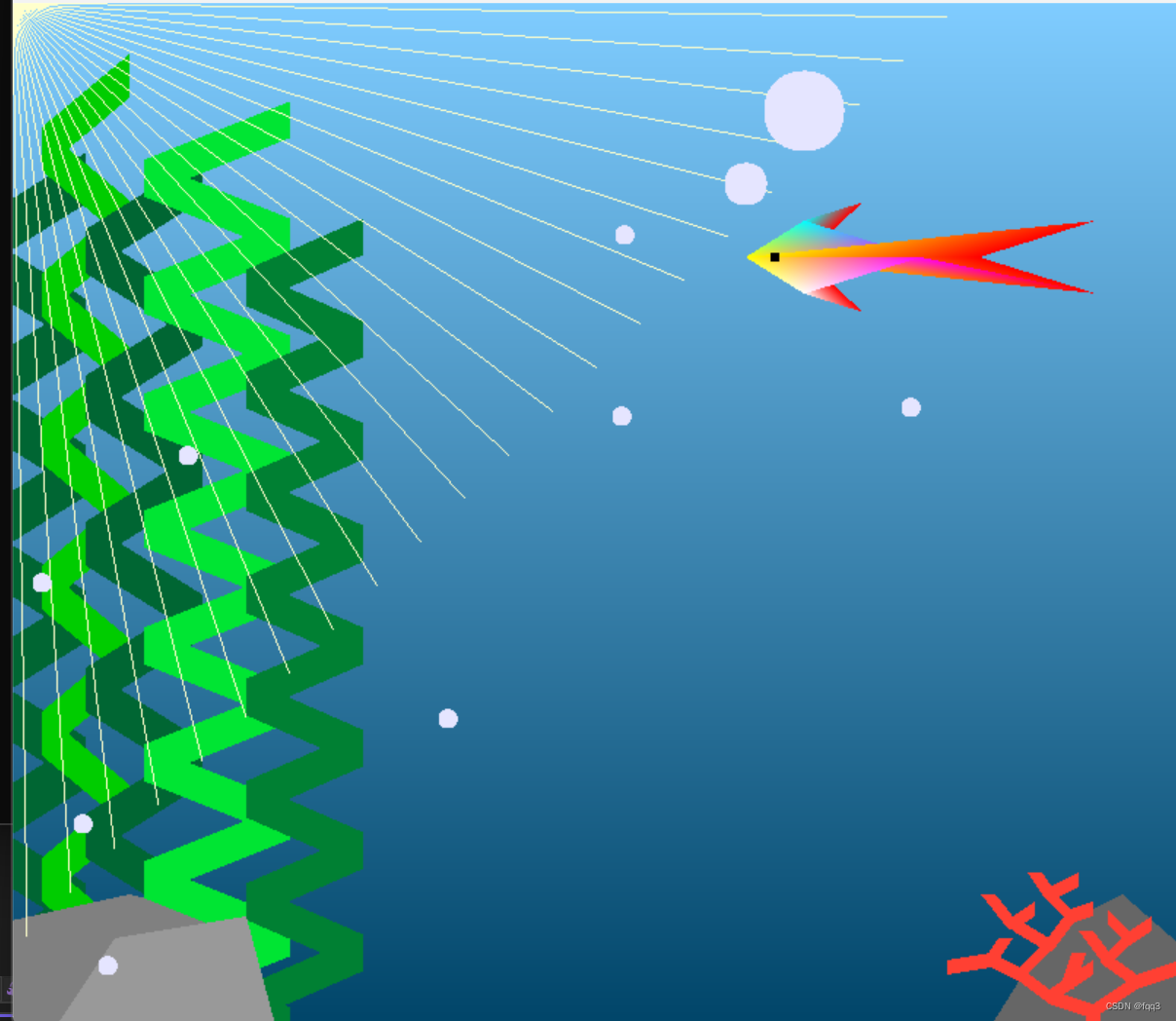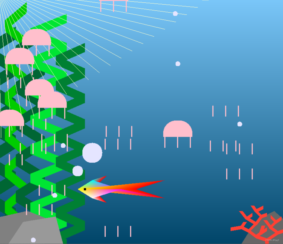 这篇文章介绍了如何使用C++和OpenGL库在Windows环境中创建一个简单的2D游戏场景,实现了小鱼的移动和尾巴的动态变化,包括渐变背景、石头、珊瑚、水草、光线等元素。