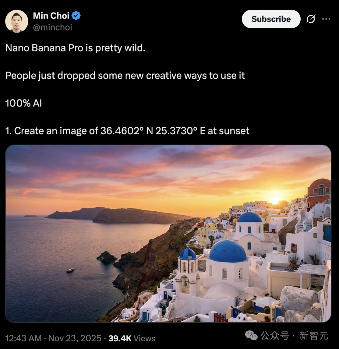 足不出户,想看「北纬36.4602° N,东经25.3730° E」的日落时刻,Nano Banana Pro满足你。
