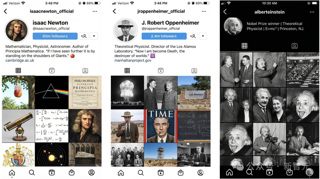 牛顿、奥本海默和爱因斯坦的现代社交软件主页: