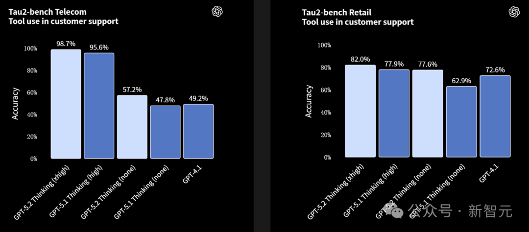 GPT‑5.2 Thinking展示了其在长多轮任务中可靠使用工具的能力,在Tau2-bench Telecom上创造了98.7%的新纪录。