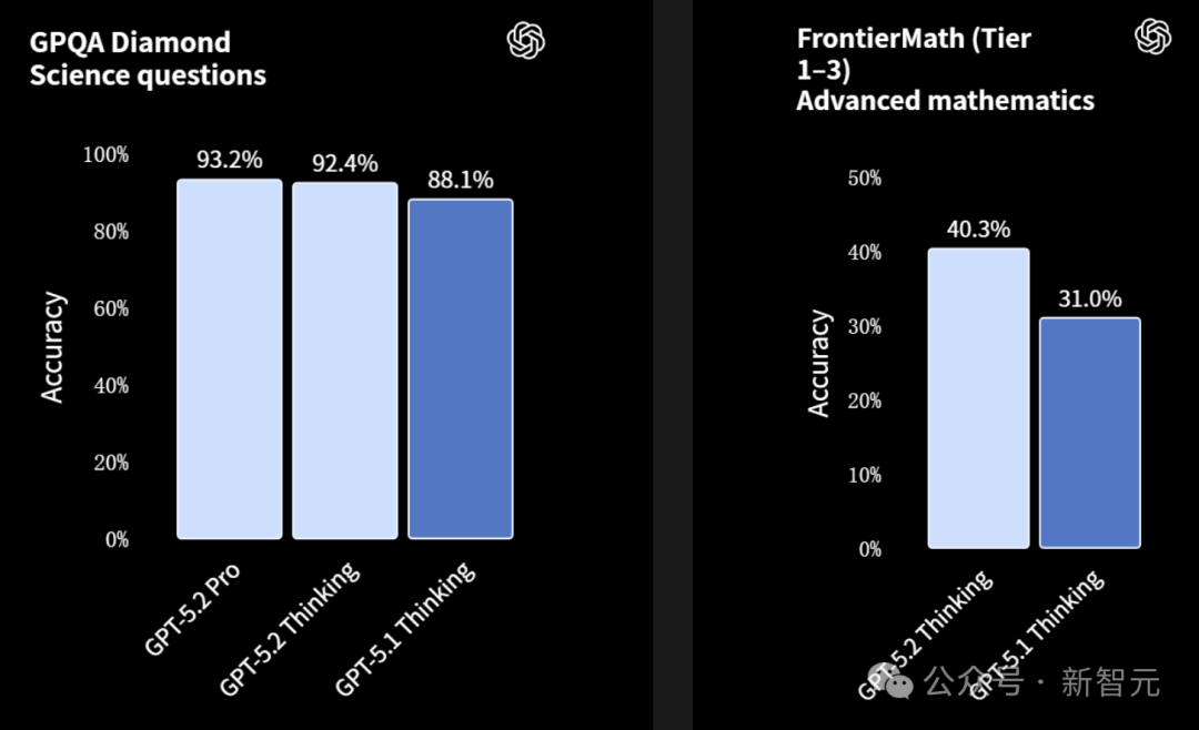 在研究生水平基准测试GPQA Diamond上,GPT‑5.2 Pro达到了93.2%,紧随其后的是GPT‑5.2 Thinking,为92.4%。