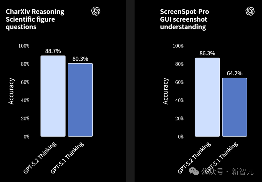 GPT‑5.2 Thinking是OpenAI目前最强的视觉模型,在图表推理和软件界面理解方面的错误率大约减少了一半。