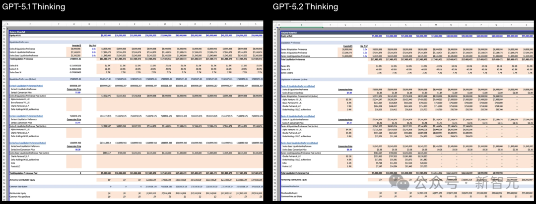 而GPT-5.1 Thinking不仅错误地计算了种子轮、A轮和B轮的清算优先权,且大部分行都留白了,导致最终的股权回报计算出错;而且还错误地在表头行中插入了计算公式。