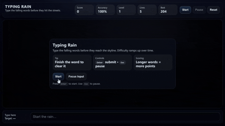 Prompt: Create a single-page app in a single HTML file with the following requirements:- Name: Typing Rain- Goal: Type falling words before they reach the bottom.- Features: Increasing difficulty, accuracy tracker, score.- The UI should be the city background with animated raindrop words.