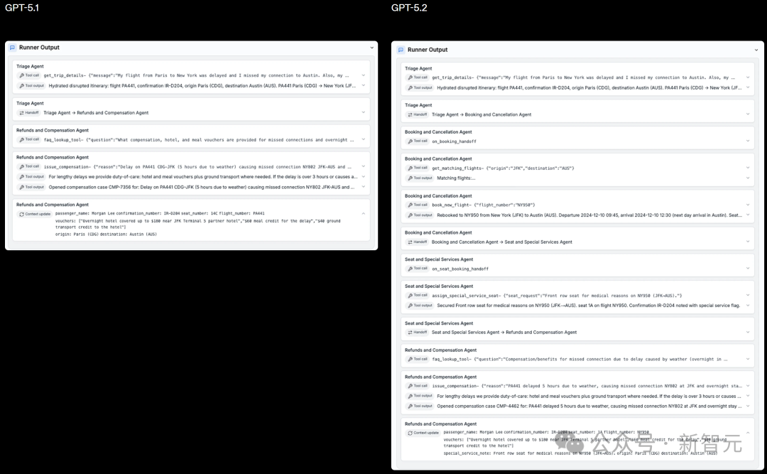 GPT‑5.2管理了整个任务链——重新预订、特殊协助座位和赔偿,提供了比GPT‑5.1更完整的结果。