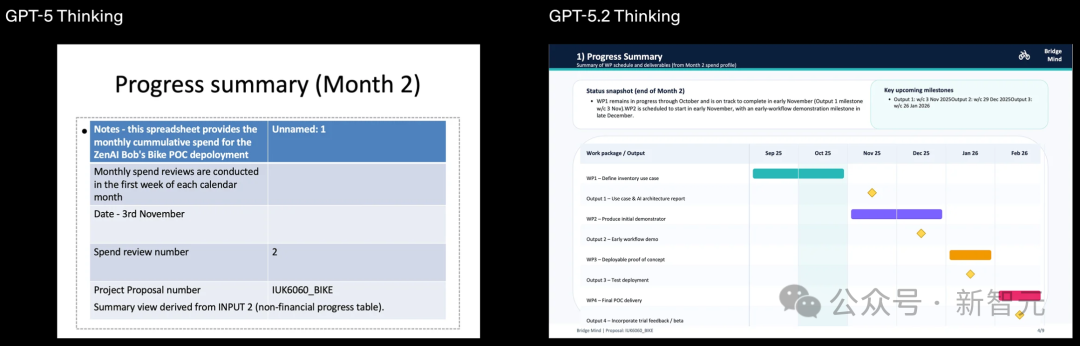 并排比较显示,GPT‑5.2 Thinking生成的电子表格和PPT在复杂度和格式上都有所改进。