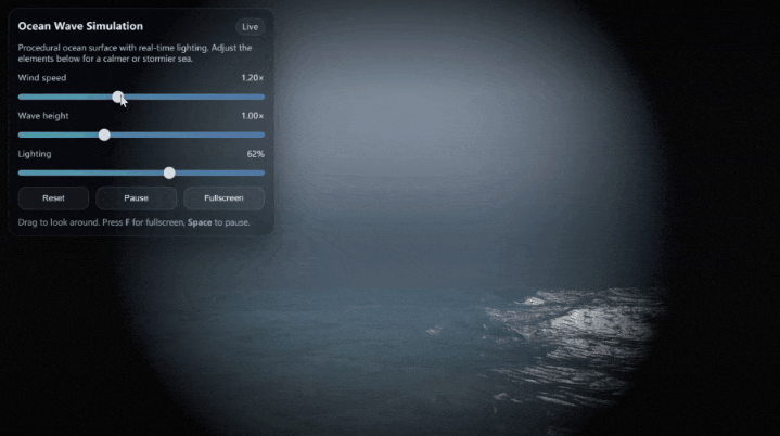 Prompt: Create a single-page app in a single HTML file with the following requirements:- Name: Ocean Wave Simulation- Goal: Display realistic animated waves.- Features: Change wind speed, wave height, lighting.- The UI should be calming and realistic.