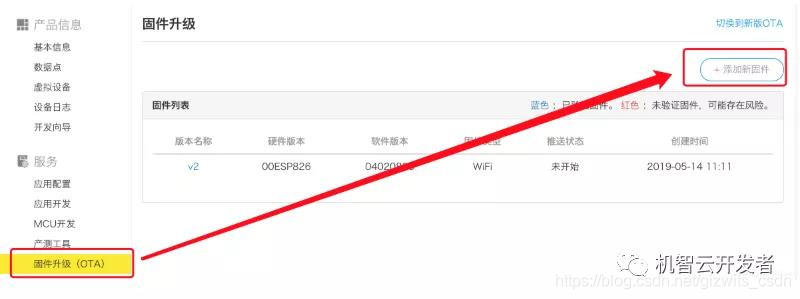 6.点击左侧固件升级(OTA),然后点击右侧添加新固件。