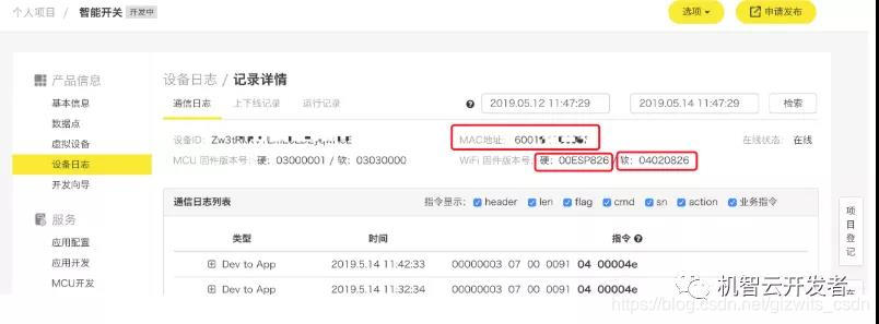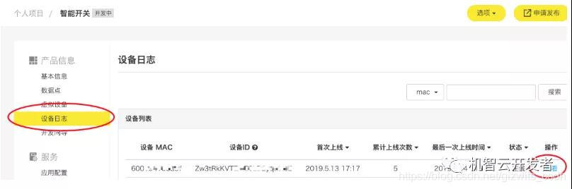 2.在产品信息-设备日志页面,点击右侧的查看: