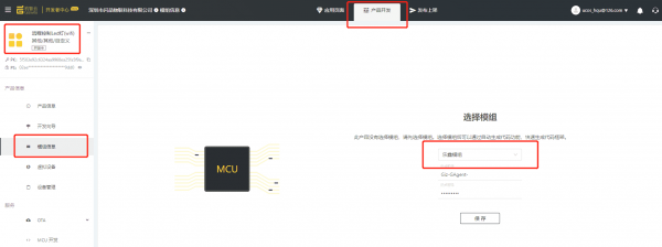 5.3 设置产品实际用的模组,这里我们用的乐鑫esp8266模组,所以请选择乐鑫模组