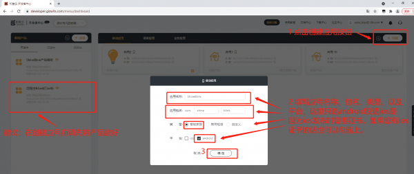 Tips1:在开始下面的工作之前先普及一个概念,一个APP应用里可以有多个产品,所以我们创建好了一个App应用,未来就可以往这个应用中添加多个产品。本教程里只为App应用添加了一个产品,即《手机App远程控制Led灯(Wifi版)》。Tips2: 下面的教程里的图片如果看不清,请按住Ctrl键+鼠标滚轮放大看。
