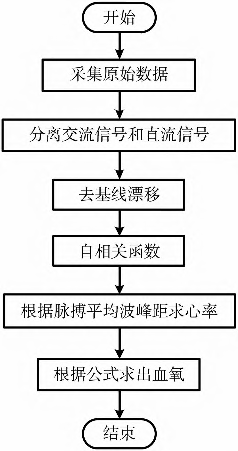 ( 5 )其中, Samples_per_second 为每秒从 MAX30102 中采集的红 外 光 样 本 数 量 , s2_max_index × FFT_N 为 脉 搏 信 号 中交流成分信号的频率, FFT_N 为快速傅里叶变换的点数长度。 若 Samples_per_second 设置为 100 , FFT_N 设置为1 024 , 从 FFT 填满数据到计算出心率值需要花 费 5 s , 但得到的各心率值间隔为 3 。 从监测测试者的心率的实时性和准确性来看, 这都是没有参考价值的。 若提高FFT 的点数长度, 虽然能提高测试心率值的精度, 但这将大大增加了监测出心率的时间, 同时加大了微控单元的负担。 本文设计心率算法使用的是第一种, 计算心率血氧的算法流程如图 5 所示。