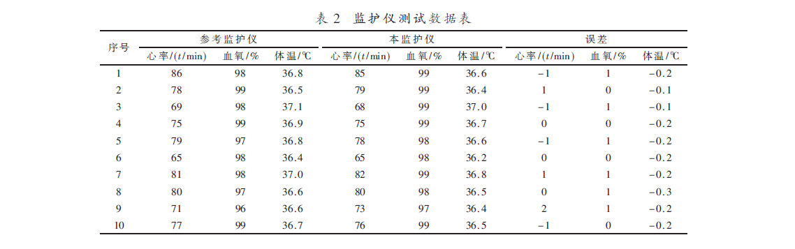 为了测试验证本次设计的监护仪的准确性, 以同一测试者 10 个不同时间点的生理参数作为测试样本, 每个时间点分别用参考监护仪和本监护仪进行 5 次采集,最后求平均值。 测试者心率、血氧和体温的测试结果如表 2 所示。