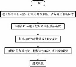 具体的按键扫描算法思想如下: 测试者按下配置按键, 单片机扫描到边沿信号, 程序进入设置了打开定时器的外部中断服务函数, 单片机处于扫描按键状态, 测试者此时可进行各种生理参数的阈值配置( 当阈值大于或小于测试者配置的数值时, 单片机会实时响应并提醒测试者) , 或者选择关闭定时器的中断开关, 从而使单片机退出配置模式, 按键算法流程如图 4 所示。