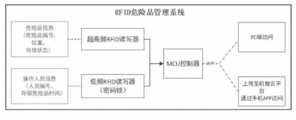 本系统硬件部分由危险品存放柜、超高频RFID读写器、低频RFID读写器、控制器MCU、PC机或Android手机组成。系统框图如图1所示。