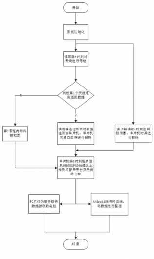 具体算法如下:超高频读写器t时刻对天线进行寻址,判断第i个天线是否返回数据,若返回数据,则读写器通过串口将数据传给单片机,单片机对串口数据进行解码并通过WiFi上传至云端;若未返回数据,则第i个的危险品被取走,单片机将取走危险品信息进行上传。同时,柜外的低频读写器读取t时刻标签信息,将信息传给单片机,单片机将数据解码得到操作人员访问信息,上传至云端。这样,危险品的实时信息均保存至云端,可通过手机端与PC端随时进行访问,获取数据。系统总体算法流程图如图2所示。