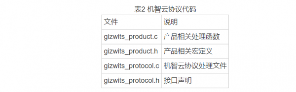 产品创建完毕后,机智云官网根据产品所建立的数据点生成协议代码,将这部分代码移植到协调器子系统的单片机工程内即可完成设备接入。机智云协议代码主要包含4个文件,如表2所示。